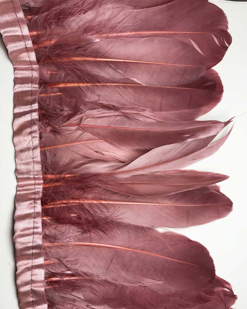 Delicately coque feather fringe adds a luxuriously sweeping accent to your designs. The feathers are sewn onto a satin fabric tape. The fabric tape can easily be sewn or adhered onto most fabrics and materials. Add this trim for dramatic flair to dance wear costumes, accessories, clothing, homeware and all kinds of art projects. 1 yard left.
